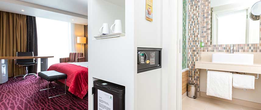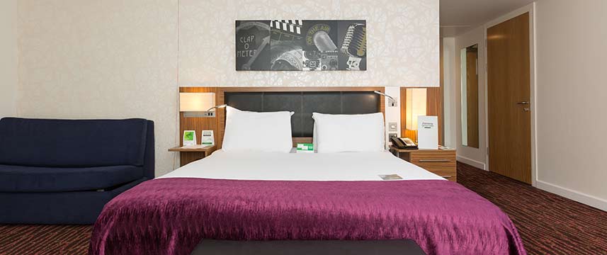 Holiday Inn Manchester MediaCity hotel offers 218 rooms over 16 floors many with good views over the Manchester Ship Canal. All include free Wi-Fi, air-conditioning, flat-screen TV, hairdryer and tea & coffee making facilities . Scoff & Banter serves casual dinner menu in the evenings and serves breakfast every morning. The Hub bar in the lobby is open throughout the day for drinks and snacks.