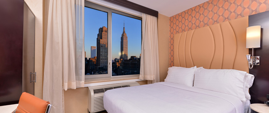 Located in Midtown Manhattan, the 3* Holiday Inn New York City Times Square is just a 10 minute walk from Times Square, one of New York`s glitziest and most vibrant locations. The hotel is also 10 minutes walk from the theatres of Broadway and the world famous Madison Square Garden. Perfect for both sightseeing and shopping, many of the city`s best known department stores are within a 20 minute walk such as Saks Fifth Avenue and Macys. By far New York`s most iconic attraction, the Empire State Building is within a 25 minute walk, as is the Rockefeller Centre. Central Park is also less than 25 minutes away on foot, or less than a 10 minute taxi ride (New York traffic allowing!).