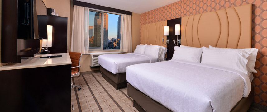 The Holiday Inn New York City Times Square`s 271 rooms are spread over the hotels 35 floors. Each air-conditioned room is decorated in muted tones and features flat screen televisions with satellite/cable, a hot drink maker with complimentary tea/coffee supplies, a mini fridge, work desk and telephone. The en-suite bathrooms come equipped with walk-in showers and hair dryers. Rattle n Hum West, the hotels onsite bar & restaurant serves food throughout the day and evening (open 6am to 12am). The bar and restaurant also offer a variety of craft beers, a diverse range of wines and bourbons, and speciality cocktails. There is also an onsite fitness centre which is open 24 hours a day.