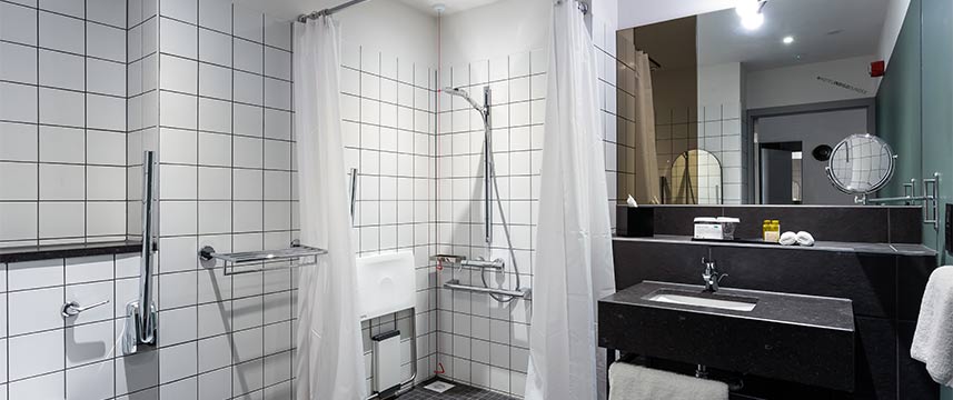 Onsite car park with courtyard drop off point. Free for 1 hour and then charges apply. 4 Accessible parking spaces.