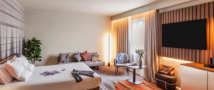 All of the spacious rooms at the Novotel Cambridge North have modern decor and are fully air-conditioned. In-room amenities include free Wi-Fi, 55-inch LCD TV with Chromecast, hairdryer, tea & coffee making facilities and ensuite bathroom with rainfall shower. Executive rooms and Suites also include Nespresso machines and bath robes and slippers. During their stay guests have use of the hotel`s indoor heated swimming pool which includes sauna and jacuzzi. There is also a fully equipped Fitness Suite. A generous breakfast buffet is served every morning and the licensed bar and restaurant offer casual dining from an international menu throughout the day.