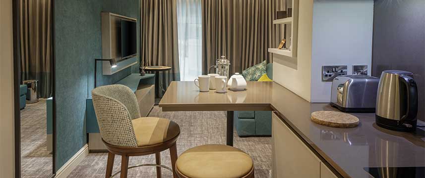 All of the Studios and Suites at the 4* Staybridge Suites Heathrow are spacious with contemporary decor and comfortable kingsize beds. There are also fully equipped kitchens and ensuite bathrooms. One bedroom suites also have separate lounge area with sofa bed. Other in-room amenities include; free Wi-Fi, flat screen tv, tea and coffee making facilities and a hairdryer. All room rates include buffet breakfast with hot and cold items. Guests can visit the Hi! Pizza Restaurant located in the Holiday Inn which is right next door.