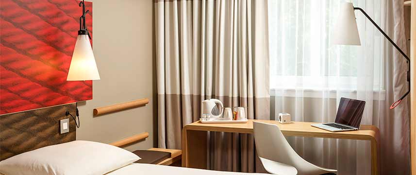 All of the 278 comfortable rooms at ibis London ExCel Docklands are ensuite and offer air-conditioning, free Wi-Fi, flat screen TV and tea and coffee making facilities. The restaurant offers a range of favourites, such as pizza, in a casual setting. Fogg`s offers coffees and a full bar menu